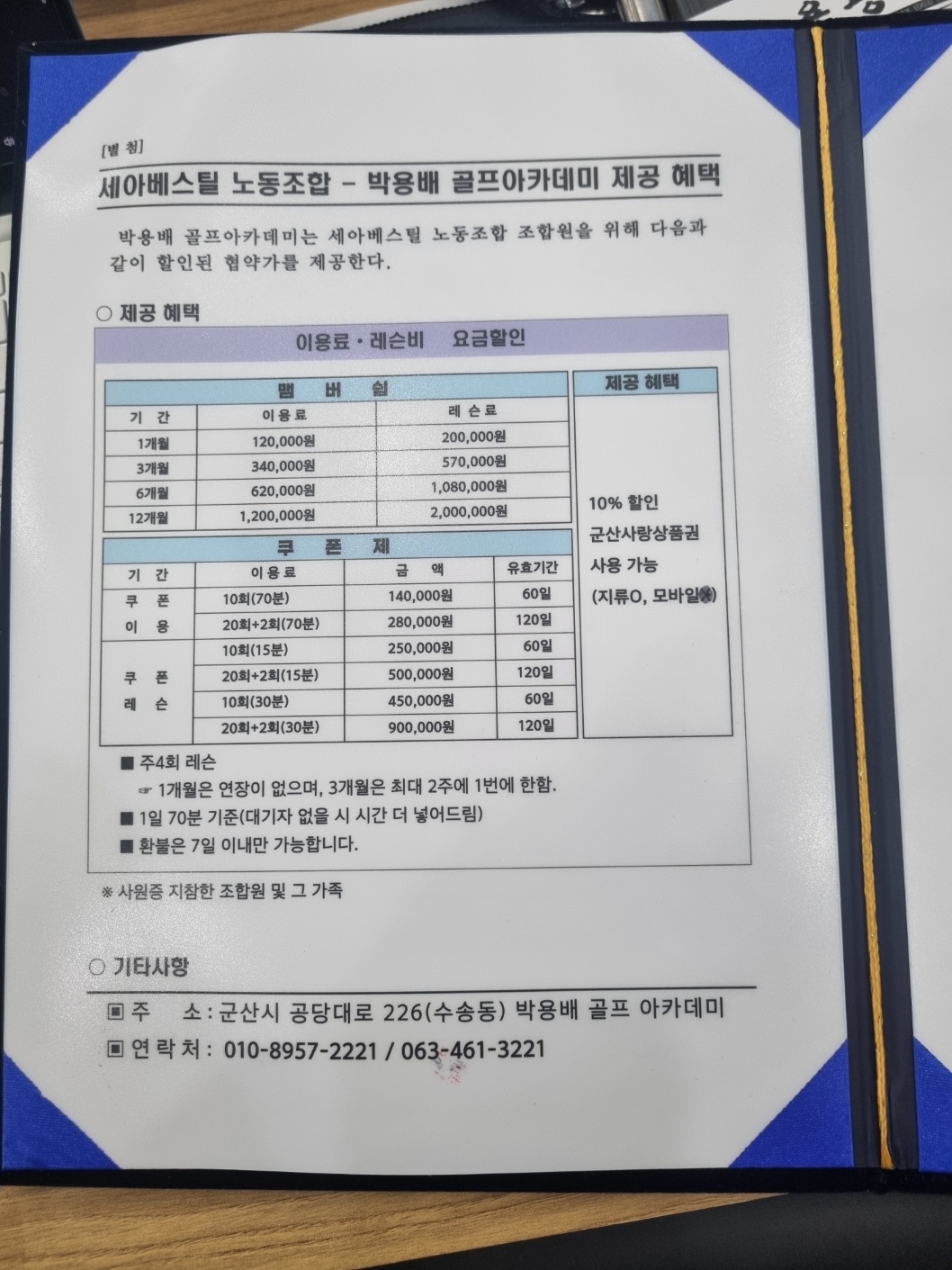 혜택 : 이용료 레슨비 할인